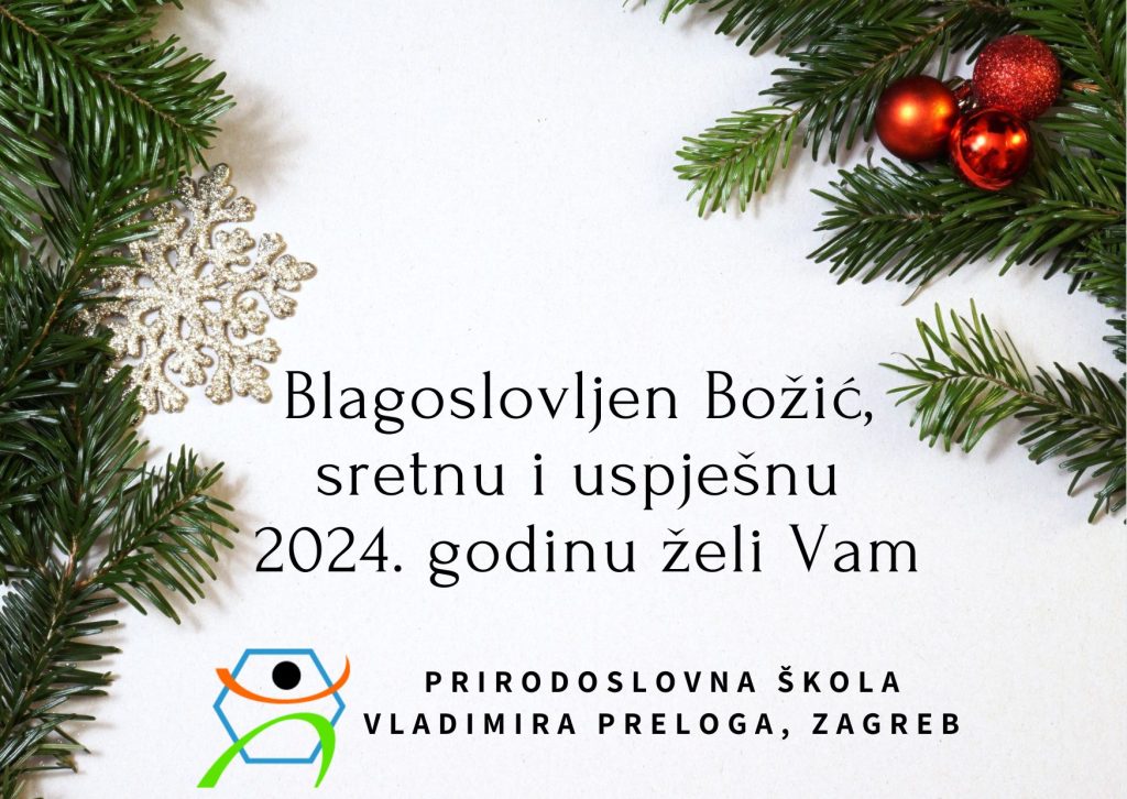 Drage učenice i učenici, uprava i djelatnici Prirodoslovne škole Vladimira Preloga žele vam sretne blagdane i uspješnu novu 2024. godinu! Božićni i novogodišnji praznici počinju 27. prosinca 2023. godine, a nastava počinje 8. siječnja 2024. prema A rasporedu.