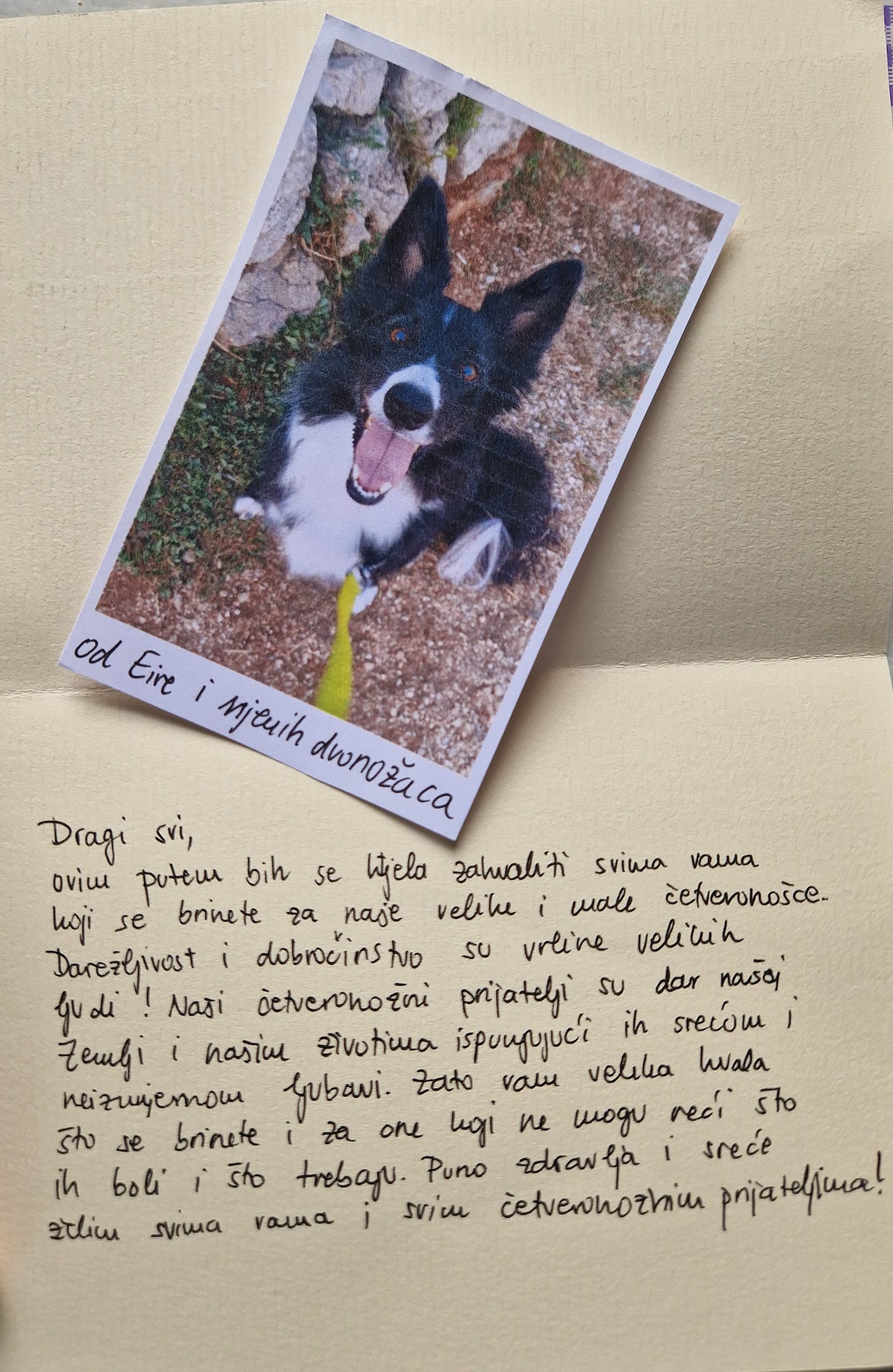 Naši učenici prikupili su značajnu količinu hrane za pse i mačke, dekica, igračaka i druge opreme, povodaca te ostalih potrepština za higijenu i njegu životinja, a posebno nas je dirnulo pismo Eire i njene obitelji koje smo predali volonterima u skloništu.