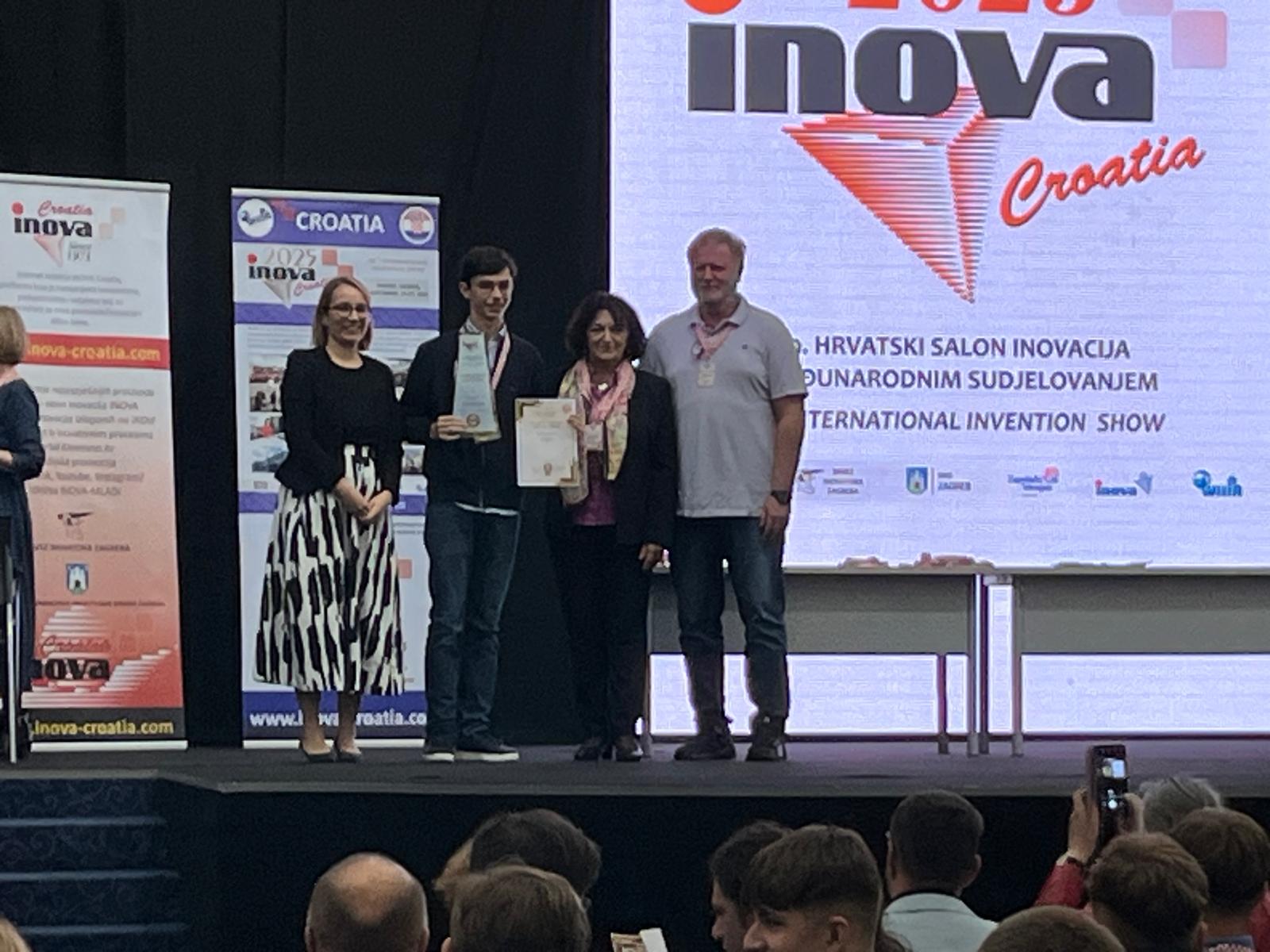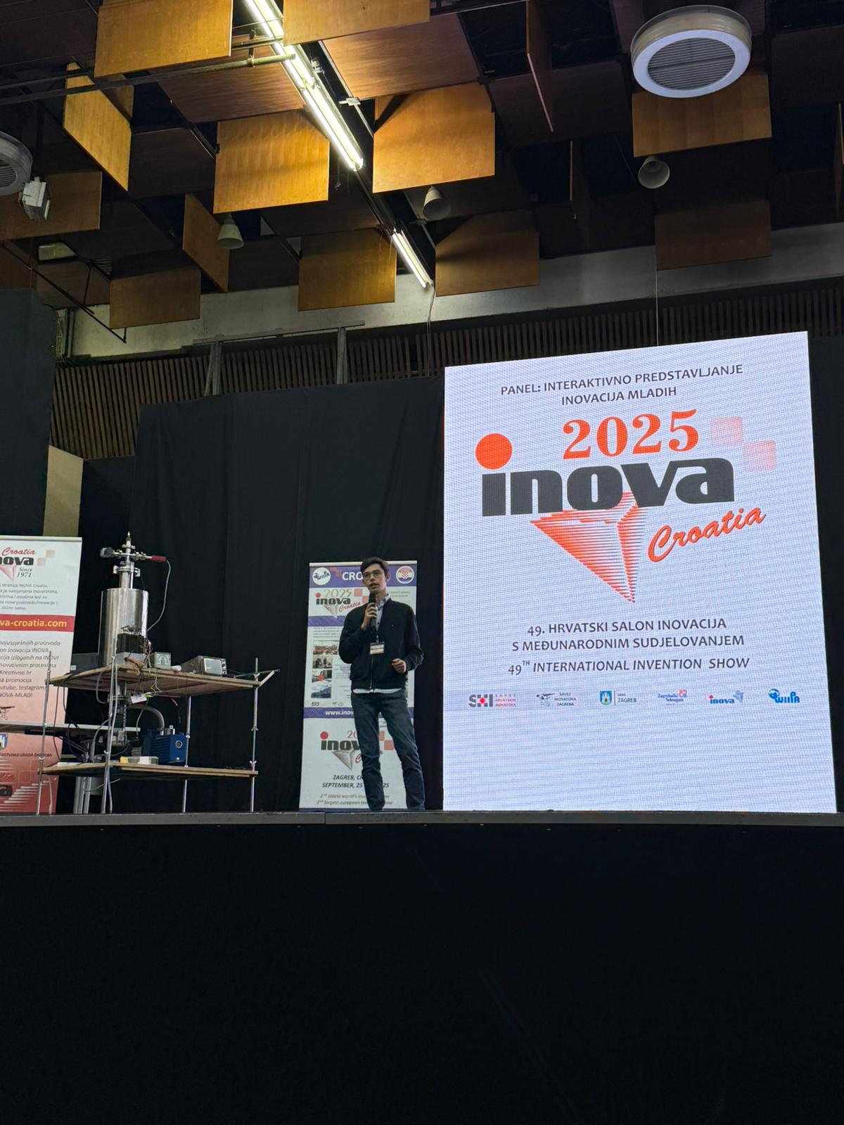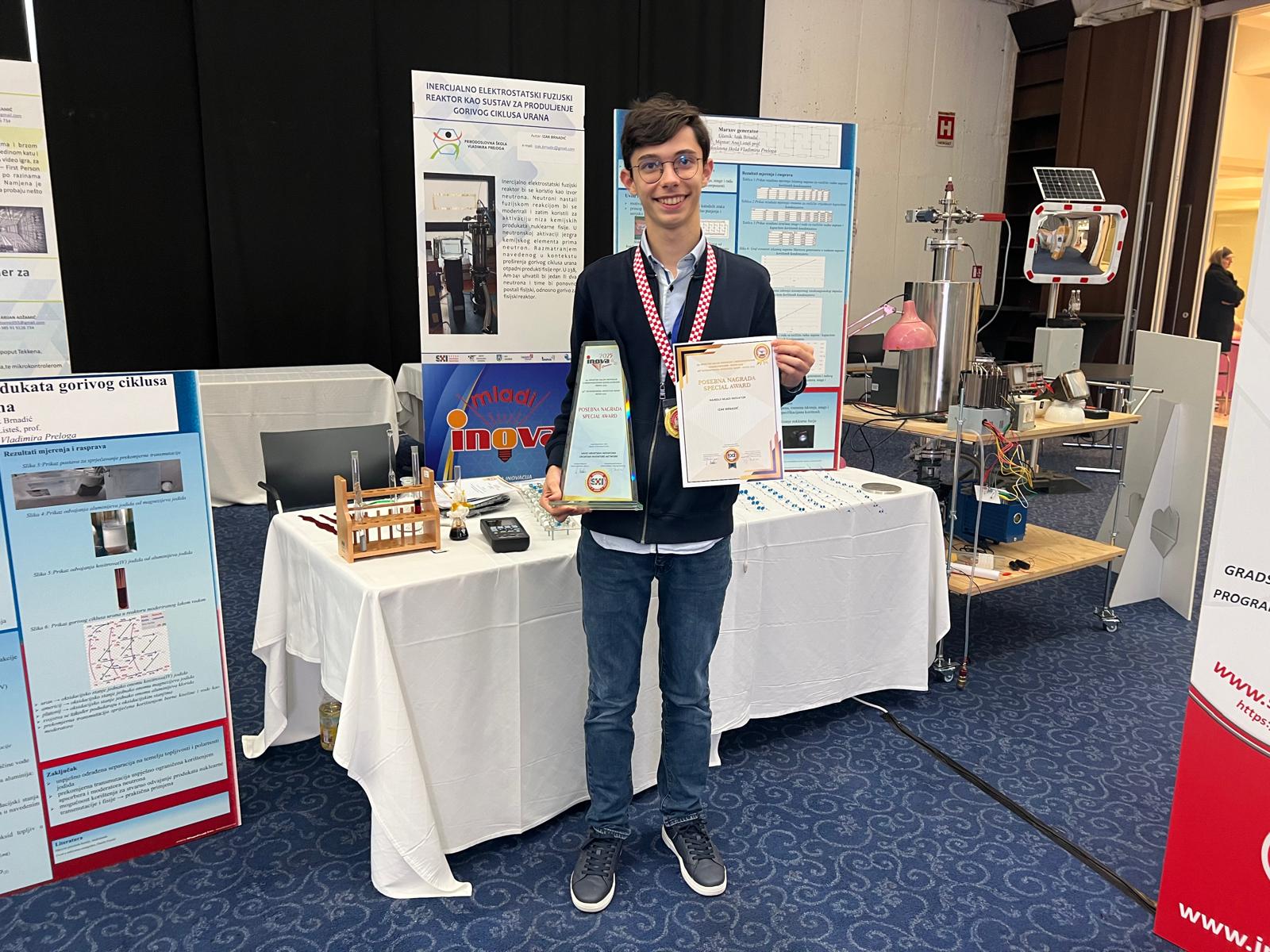 S ponosom ističemo da je Izak Brnadić, učenik 3.B razreda, sudjelovao na 49. Hrvatskom salonu inovacija s međunarodnim sudjelovanjem i u kategoriji Interaktivno predstavljanje inovacija mladih – INOVA 2025. Predstavio je svoju izuzetnu inovaciju pod nazivom „Inercijalno elektrostatski fuzijski reaktor kao sustav za produljenje gorivog ciklusa urana“, za koju je nagrađen najvećom nagradom salona inovacija INOVA. Izakov štand s inovacijom posjetili su članovi delegacije Tajvana, Tajlanda, Ukrajine, Rumunjske, WIIPA-e te brojni hrvatski inovatori.