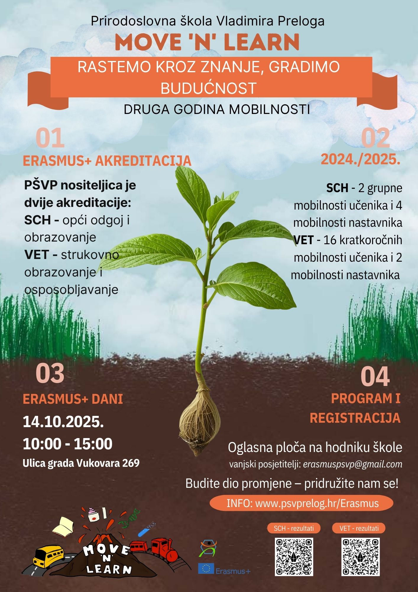U drugoj godini provedbe Erasmus+ akreditacije nastavljamo naš put rasta i razvoja: 2025. „RASTEMO KROZ ZNANJE I GRADIMO BUDUĆNOST“. U okviru projekta MOVE ‘N’ LEARN, naša škola postaje prostor kretanja, učenja i povezivanja – mjesto gdje ideje oživljavaju, a iskustva se pretvaraju u prilike.