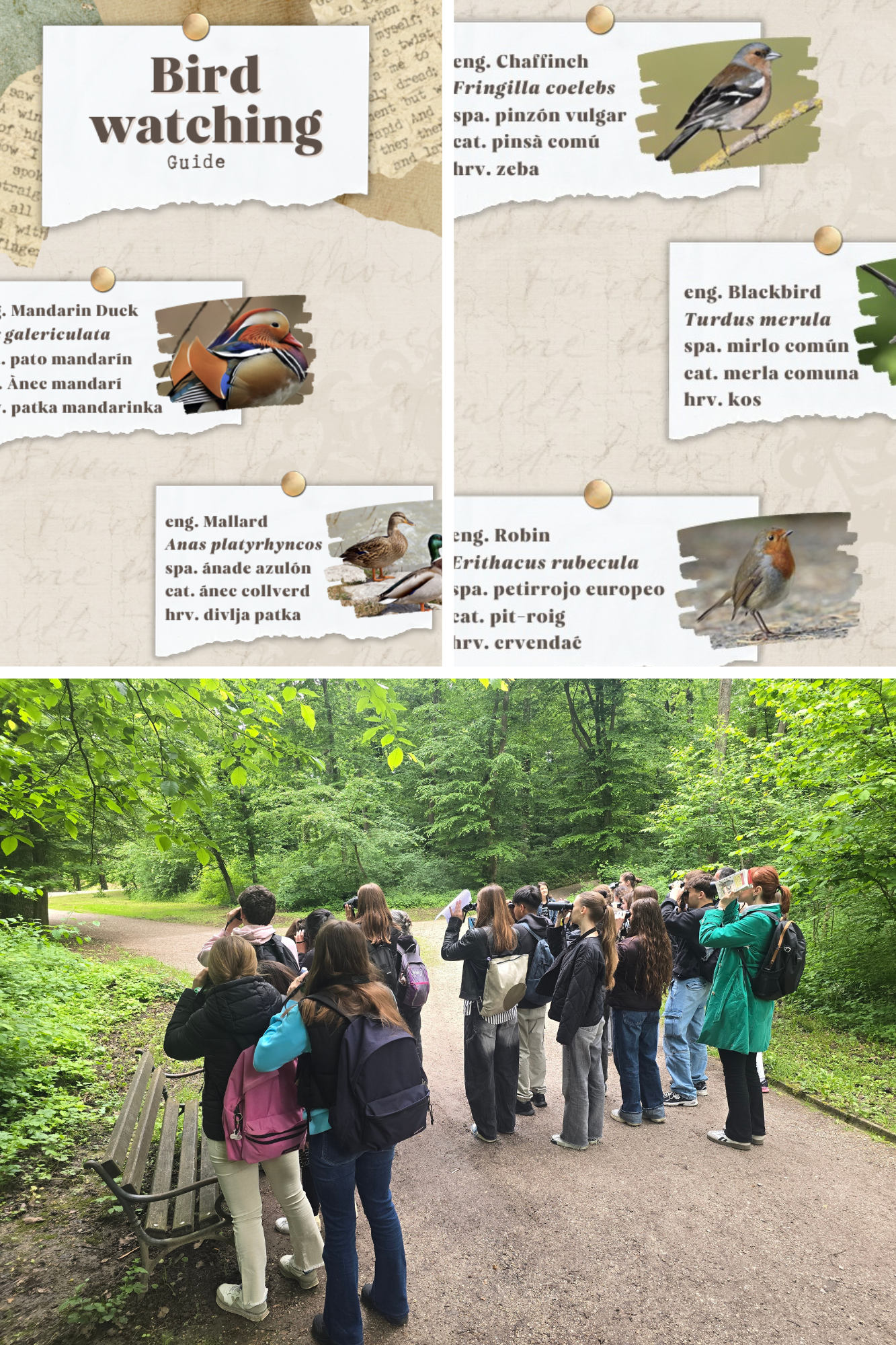 U sklopu pripremnih aktivnosti za mobilnost, nastavnica je zajedno s učenicima posjetila udrugu BIOM, gdje su sudjelovali u edukacijskoj radionici o izradi vidljivijih stakala za ptice. Nakon toga, u suradnji s udrugom BIOM, organizirano je i promatranje ptica u parku Maksimir, a kako bi lakše prepoznali vrste koje su uočili, učenici su izradili višejezični digitalni vodič s pticama našega grada.