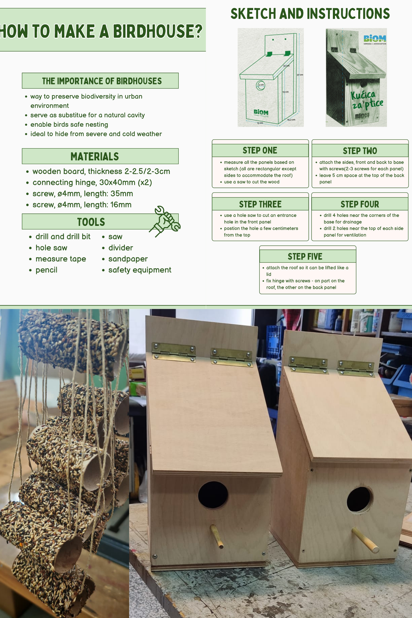 Kako bi prirodu približili i školskom okruženju, učenici su primijenili naučene vještine u praksi te izradili i postavili kućice za ptice u školskom vrtu, a tijekom mobilnosti u Španjolskoj naučili su i kako izrađivati hranilice za ptice. Sve su kućice i hranilice izrađene od recikliranih i prirodnih materijala, a učenici su, uz brigu za okoliš, pokazali kreativnost, snalažljivost i poduzetničke vještine. Ako poželite samostalno izraditi kućicu za ptice, detaljne upute, troškovnik, ali i video pronaći ćete na sljedećoj poveznici. 🐦⬛