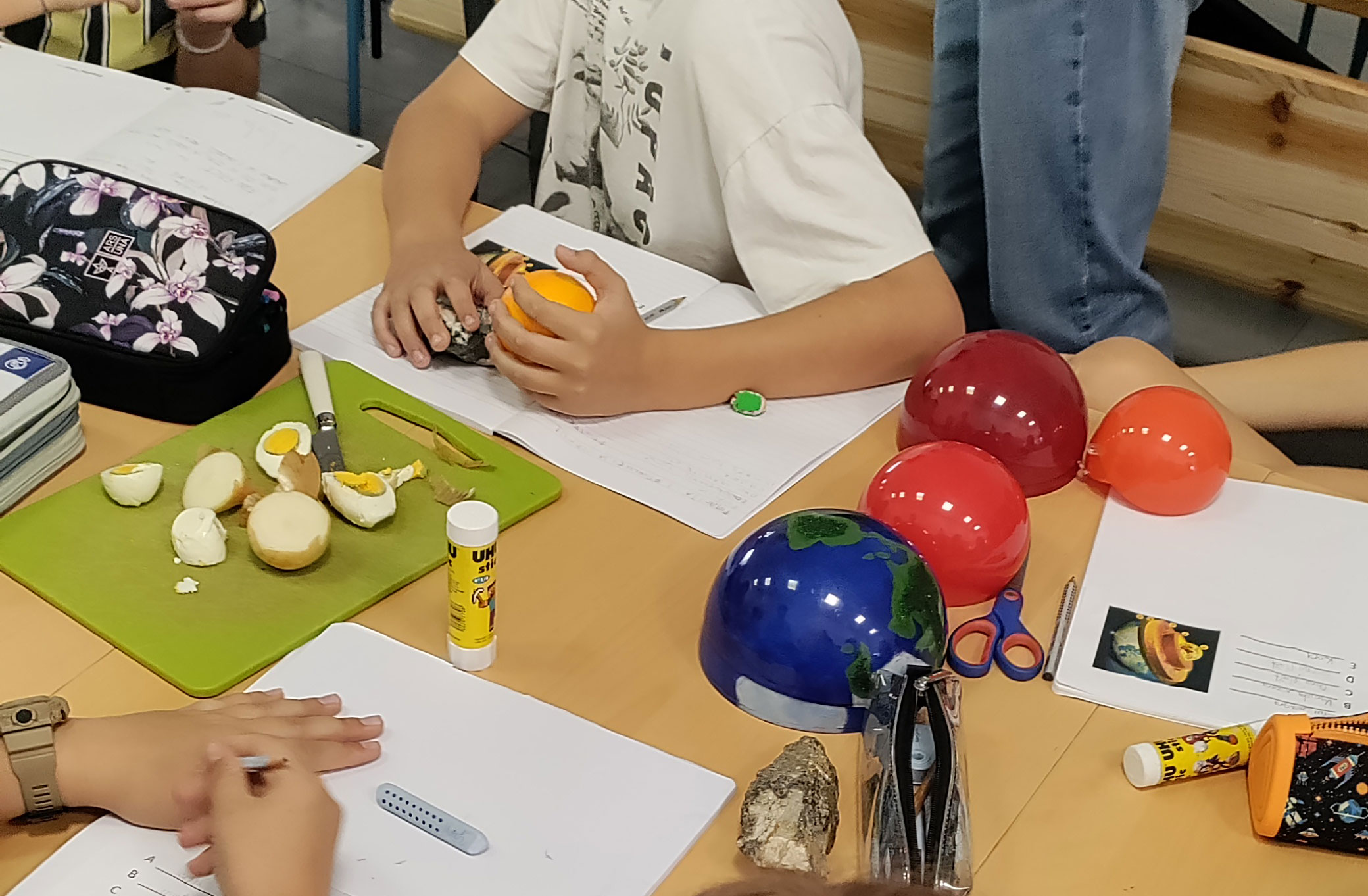 Radionica na temu građe Zemlje za 5. razred osnovne škole obuhvatila je pokazivanje, ne samo kreativnih, već i kulinarskih vještina. Na primjeru kuhanog jajeta i izrezanog luka, kao predmeta koji su nam poznati, učenici su objasnili slojevitu i ljuskavu građu Zemljine unutrašnjosti. Litosferu su predstavili slagalicom od 7 većih i 6 manjih litosfernih ploča koje su osnovnoškolci trebali sastaviti i odrediti na koji način se ploče pomiču. S obzirom na to da su posljedice pomaka na granicama ploča ponekad i razorni potresi, radionica je završila vježbom ponašanja u slučaju potresa.