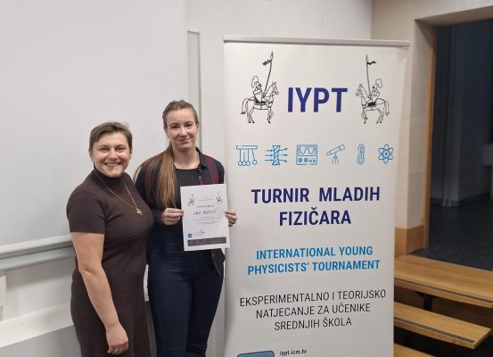 Dok su većini učenika počeli ljetni odmori, naša učenica Lana Azenić (2.G) borila se za Hrvatsku na Međunarodnom turniru mladih fizičara (IYPT) u Lundu, Švedska, gdje je osvojila počasnu medalju. Da bi se kvalificirala u hrvatski tim, Lana je prvo nastupila na 22. Hrvatskom turniru mladih fizičara, održanom 22. prosinca 2024. na Institutu za fiziku.