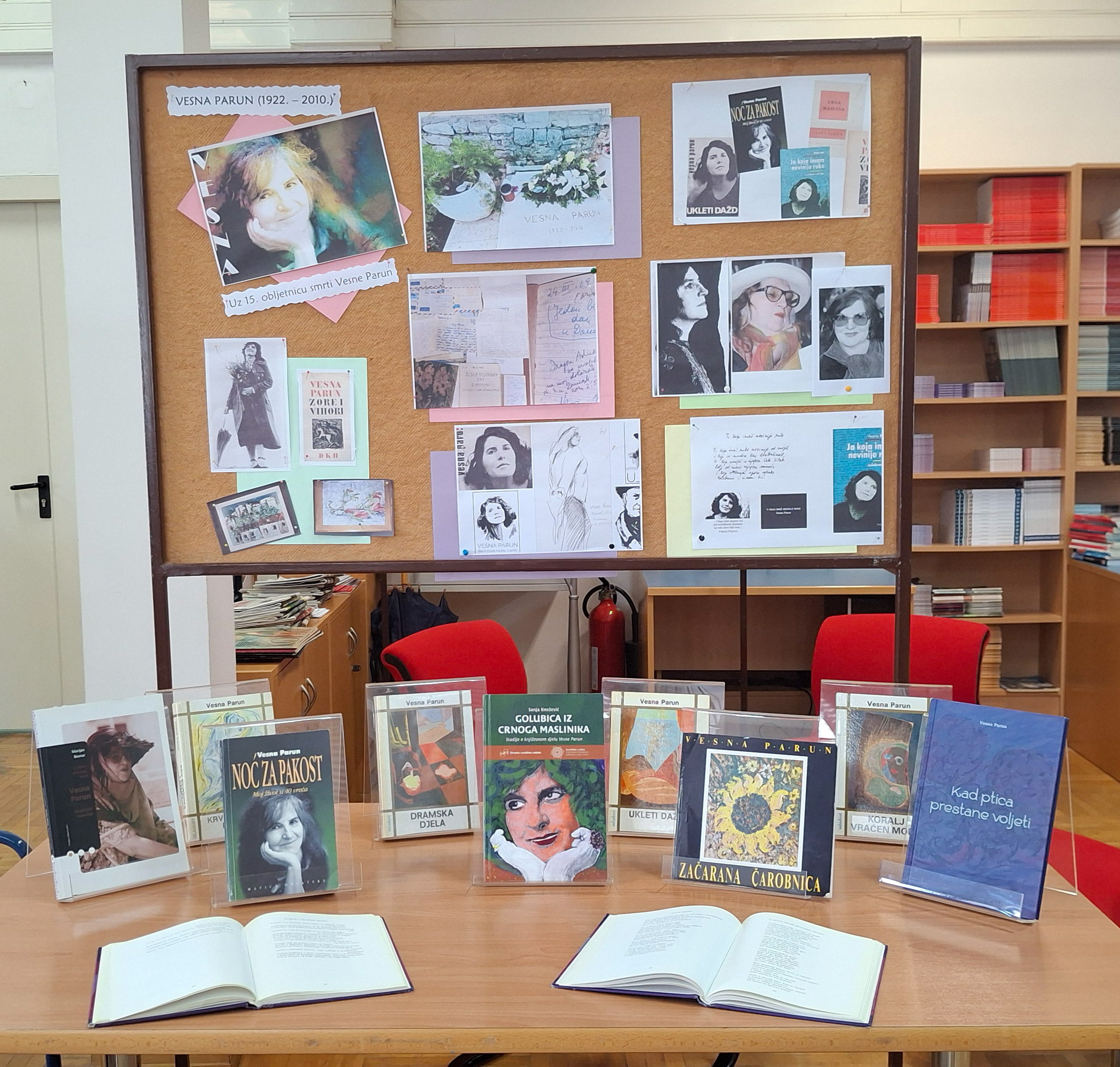 U skladu s motom ovogodišnjega MHK-a „Odabrali knjižničari“ naše su knjižničarke odabrale da upravo prisjećanjem na jednu od najvećih hrvatskih pjesnikinja, koja nas je napustila prije točno petnaest godina, započnemo ovu nacionalnu manifestaciju. U knjižnici je postavljena izložba Vesninih likovnih i pjesničkih radova iz grafičko-pjesničke mape Slikom i stihom – Vesna Parun. Mapu je uredio