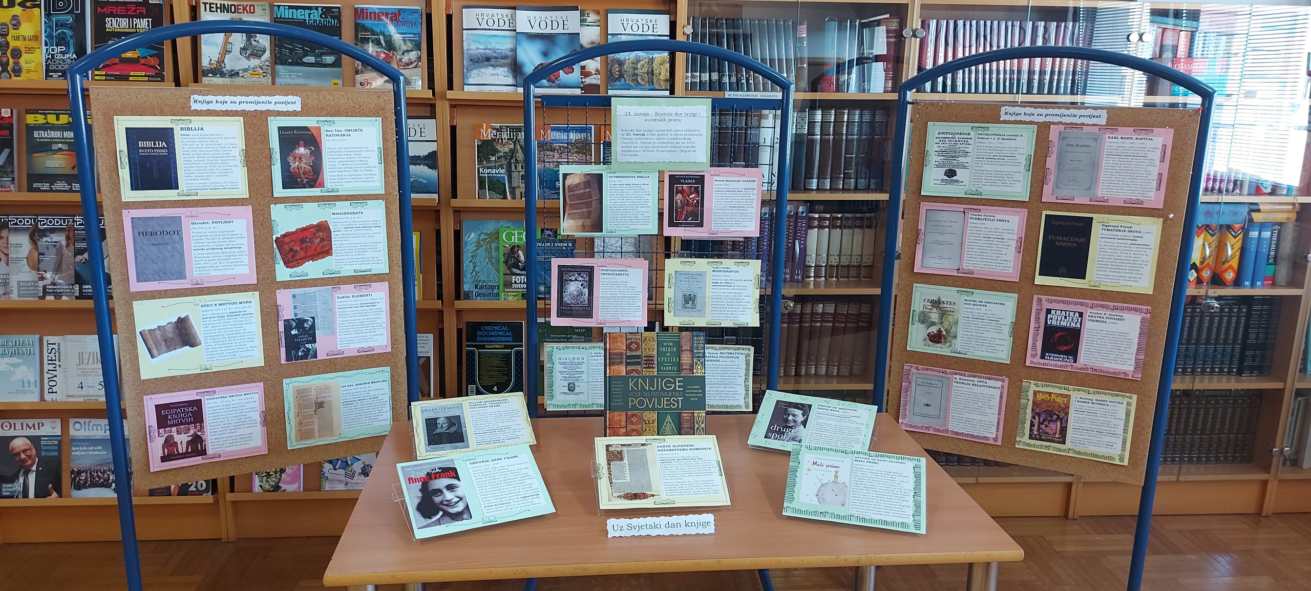 Svjetski dan knjige i autorskih prava obilježava se 23. travnja kao simboličan datum jer su toga dana 1616. godine umrli velikani svjetske književnosti Miguel de Cervantes i William Shakespeare. Toga se dana diljem svijeta odvijaju brojne aktivnosti kojima se promoviraju knjige i potiče čitanje. I naša se knjižnica uključila u obilježavanje tog datuma postavljanjem prigodne izložbe „Knjige koje su promijenile povijest“