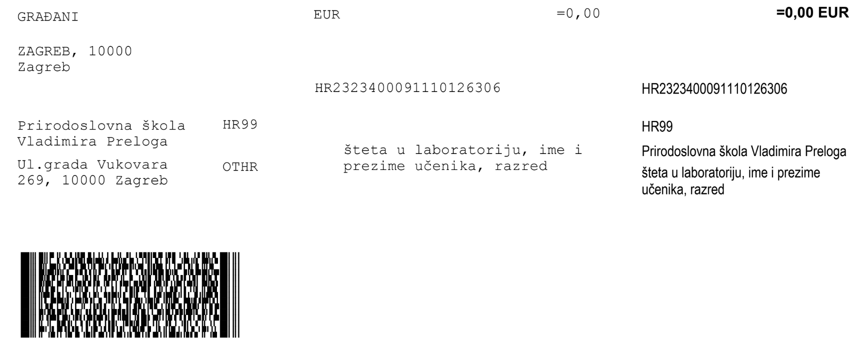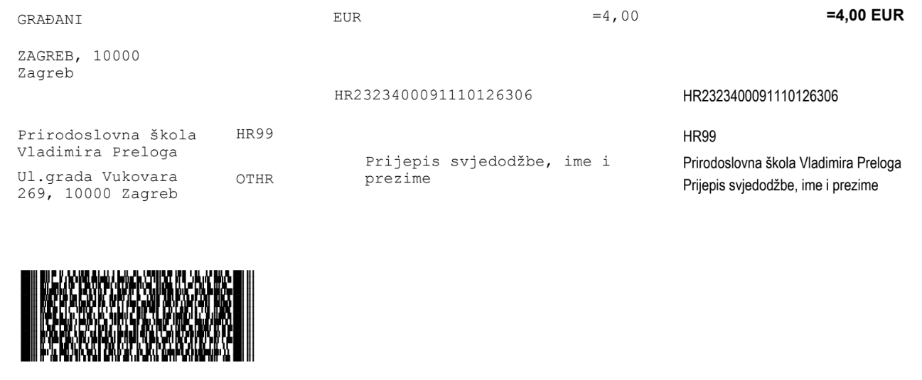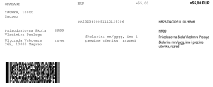 Uplatnica s bar kodom za plaćanje školarine za dvojezičnu gimnaziju.
