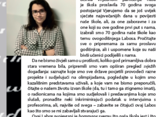 Naš je školski list Labos ponovno, četvrtu godinu zaredom, pozvan na Državnu smotru LiDraNo. Konkurencija je velika pa je ovo zaista posebna čast i dobra motivacija za još bolji idući broj! Čestitke svim novinarima <3! Glavna urednica: Iris Delić Izvršna urednica: Marta Paladin Novinari: Iris Delić Laura Kodić Matija Mrvičić Marta Paladin Ivana Gvozdić Jelena